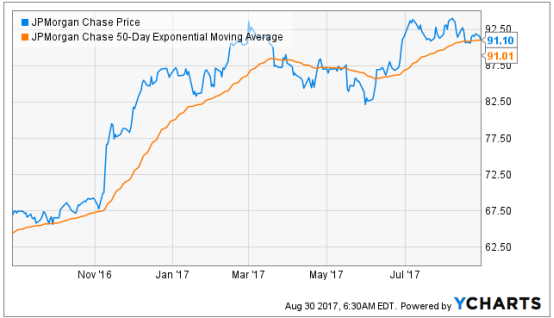 2017上半年,摩根大通(NYSE: JPM,以下简称小摩)延续了去年出色的业绩表现。2017上半年小摩净营收同比增加5.3%,主要是由于净利差持续增长以及资产管理和交易营收增加。小摩过去四个季度的营收处于2011年第三季度以来的最高水平,净利润和每股收益也处于历史高位。今年上半年的每股收益同比大增20%。