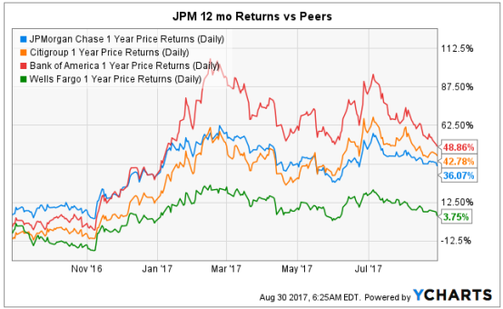 同行中美国银行、花旗银行和富国银行同期内的涨幅分别为49%、43%和4%。可以看出小摩涨幅位居第三。
