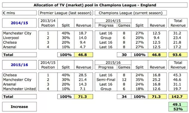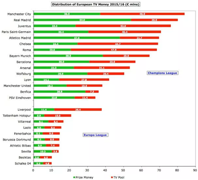除了奖金之外,俱乐部都会获得电视转播的分成,15/16赛季欧冠的电视转播收入达到了5亿7800万欧元。每个国家的市场分成是根据国家电视转播收入来划分的,这也意味着英格兰的俱乐部将从BT体育的天价转播合同中获得高额利润。