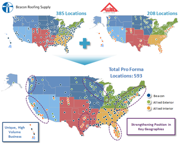 Beacon Roofing Supply是北美最大的住宅及非住宅屋面和辅助建筑产品分销商之一,公司在美国48个州、加拿大6个省份里拥有380个服务网点,员工超过5000名。公司产品包括窗户、侧板、屋顶、防暑等建筑产品,作为行业领导者,公司与品牌制造商建立了牢固的合作关系。