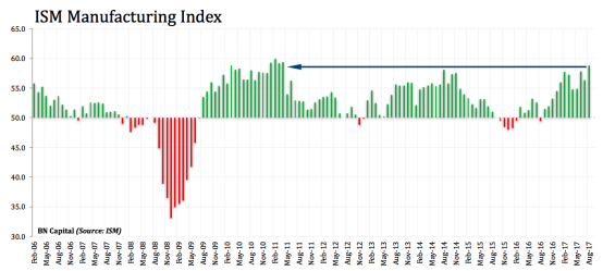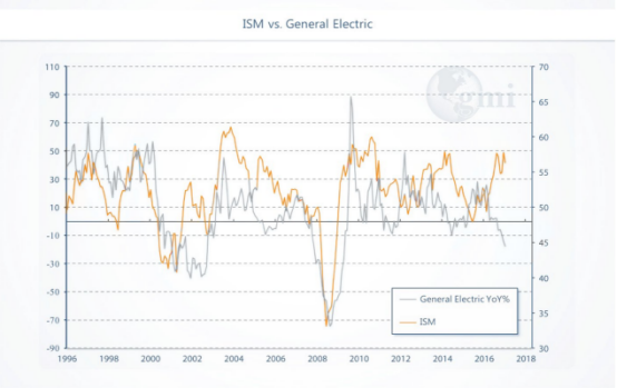 分别对比各个行业和行业龙头公司的股价可以发现,通用同行的股价表现远超通用。下图是ISM制造业指数历年来的走势情况。
