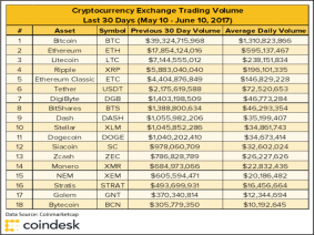 在2017年6月10日至2017年6月10日的30天期间,显示了大多数加密货币的交易量减少。