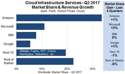 智能AI助手的基础能力云计算,谷歌云目前虽然不能与亚马逊、微软相抗衡,但是仍然处于第一梯队。通过下图可以看出,亚马逊遥遥领先,紧随其后的就是微软、IBM,然后就是谷歌。
