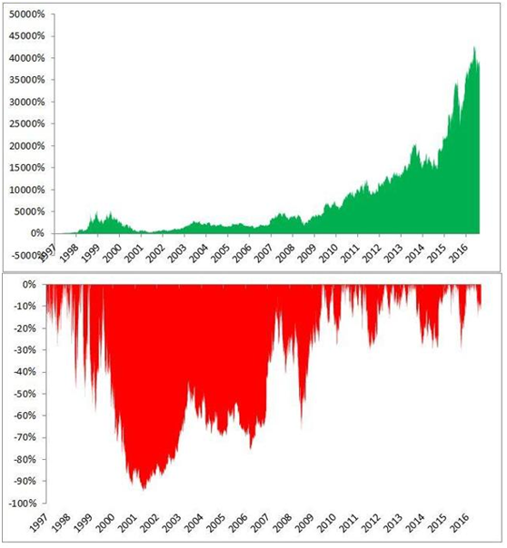 相比同样幅度的上涨带来的赚钱的喜悦,许多市场参与者在下跌时经历了两倍的痛苦。如果从1997年就持有亚马逊,那么这痛苦是怎样的呢?