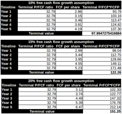 如果以自由现金流折现模型计算公司估值,假设自由现金流同比增长10%-20%,公司估值在97-151美元之间。但是这样的假设,由于每股现金流支付的太多,造成模型的建立与现实不相符,因此有失妥当。