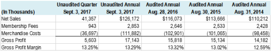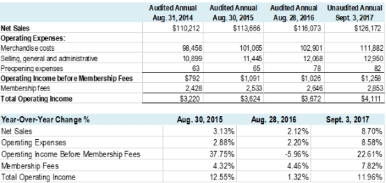 在会员费和微薄但持续的利润支撑下,好市多的营运利润仍然有不错表现。最新财报显示,好市多的同店销售额和业绩增长数据都十分亮眼,接下来将对比公司未经审计财报的基础数据与之前财年的历史数据。