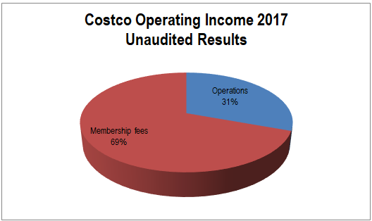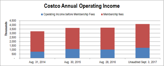 接下来看好市多的营运利润,这里不把好市多的会员费收入和总运营开支计算在内。从下面的图表中可以看出,维持会员制度和吸引新会员给好市多造成了一定的营运开支和间接费用,不过假设大部分营运开支相对销售额是合理的,那么这也对公司财务也没有什么坏影响。