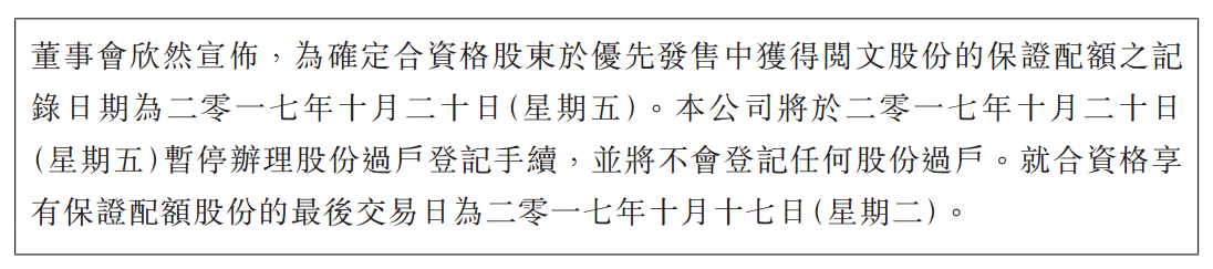 公告显示,记录日期为2017年10月20日(星期五),而港股实行T+2交收,所以想要完成股份过户登记手续,最后交易日为2017年10月17日(星期二)。
