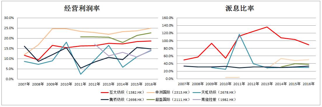 从下图可见,互太纺织的经营利润率一直保持于约17%的水平,只是逊色于港股白马股龙头大哥申洲国际(2313.HK)及专生产女性高端内衣物料的超盈国际控股(2111.HK)。