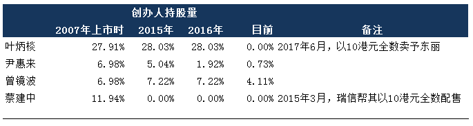 除了创办人之外,根据公司2017财年年报,副主席刘耀棠及已于2017年5月22日辞任非执行董事的林荣德分别持有公司股权3.63%和8.00%。