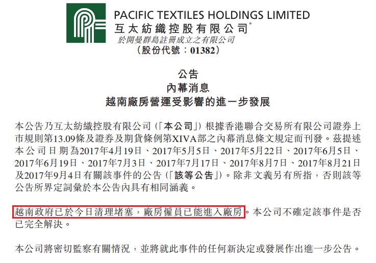 事件源于越南当地村民对政府收回其土地用以建厂所得的土地补偿感到不满。经过多个月的协商交涉后,公司于9月25日公布,越南政府已清理堵塞,而厂房雇员已能进入厂房。