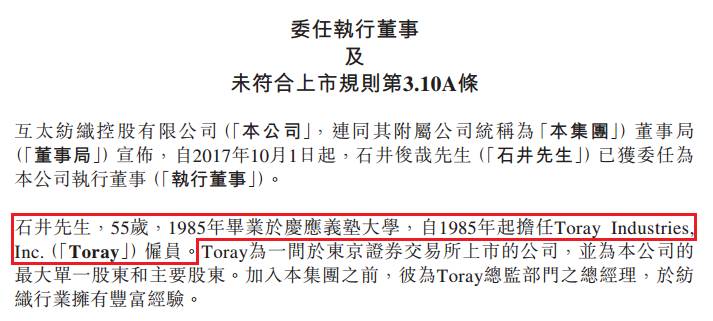 互太纺织为东丽的客户长达16年之久,来自东丽的采购占2017财年总销售成本约4%或1.93亿港元。