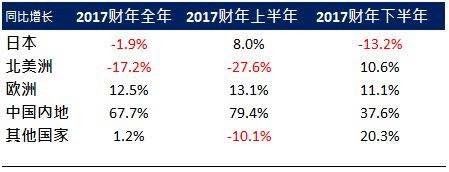 迅销明显提出2018年财年的整体收入增长达10.1%,即是较2017年的4.2%有较大幅度的增长。在过去一至两年日本市场一直是公司整体增长放慢的主要原因之一,从下表可以看到日本2017年财年的下半年同比增长大幅下跌13.2%。