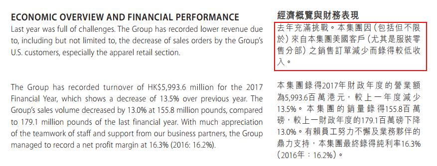 不过一错不能抵百,到了2016、2017财年,公司的收入跟盈利都双双下滑,原因是公司过往一段时间累积回来的重量级客户,优衣库和L Brands等客户需求疲弱影响。
