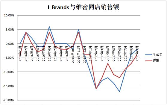 从下图可看到,L Brands和维密的销量额于7月开始回暖,下降势头似乎已经趋缓,到了8月数据显示同店增长减少已收窄至4%,9月最新数据更是进一步上升至降2%而已,市场部份人士预计数据能在2017年底实现正增长的复苏。
