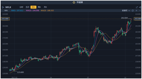 美国流媒体视频服务提供商Netflix在昨夜收盘以后发布公司2017财年第三季度财报显示,公司业务继续增长,订阅人数在这个季度中净增加了530万人。上周五,公司股价有史以来首次突破200美元,昨夜再度创下历史收盘新高,收报202.68美元,涨幅达1.60%;盘中一度触及202.83美元高点。财报发布以后,公司在截至美国东部时间周一下午4:26的盘后交易中,再度上涨4.97美元,至207.65美元,涨幅为2.45%。