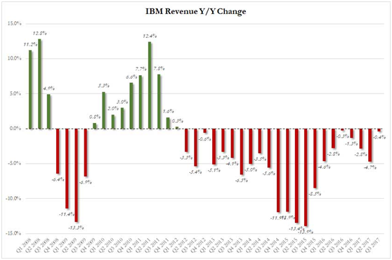 下图为2008年以来IBM营收同比增速变化。尽管三季度营收同比仍然为负,但营收同比持续下滑的势头已经减弱。