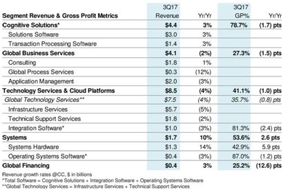 公司核心业务专注于认知解决方案、云平台,致力于提升产业效率、专业化,包括五大业务部门:认知解决方案、全球商业服务、云平台技术服务、系统性服务、融资服务。