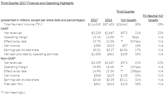 支付服务提供商贝宝在本周四盘后发布公司2017年第三季度财报。财报显示,贝宝的营收同比增长21%至32.39亿美元,超出分析师此前预期的31.8亿美元,不计入汇率变动的影响为营收同比增长22%。美国通用会计准则和非美国通用会计准则下的营业利润率分别为13.1%和19.9%。美国通用会计准则下的每股收益同比增长17%至0.31,非美国通用会计准则下的每股收益同比增长31%至0.46美元,超出分析师预期的0.44美元。营运现金流为10.06亿美元,自由现金流同比大增36%至8.41亿美元。