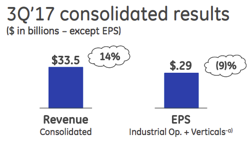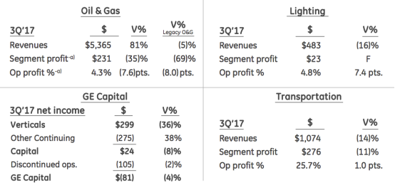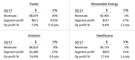 通用电气2017年第三季度营收为335亿美元,相较去年同期的293亿美元同比增长14%,超出分析师平均预期的325亿美元。调整后每股收益为0.29美元,远远低于分析师预期的0.49美元。