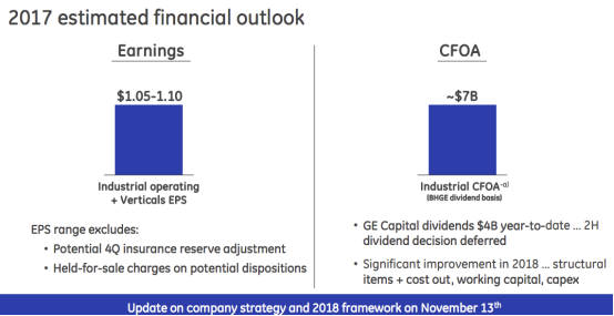 公司将全年每股盈利下调至1.05美元到1.10美元之间。按照全年每股盈利为1.05美元计算,通用电气2017年的市盈率为22。