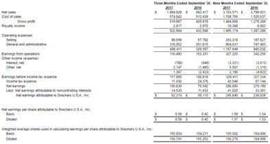 斯凯奇第三季度财报显示,公司销售额同比大涨16.7%至11亿美元,季度收入再次突破10亿美元;净利润则同比暴涨42%至9230万美元,毛利率从去年同期的45.6%升至47.5%,均高于华尔街分析师预期。