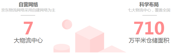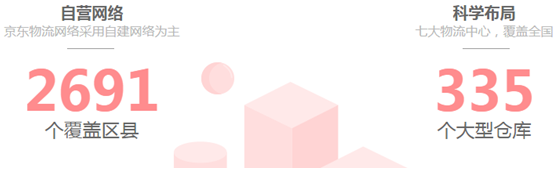 目前,公司在全国范围内拥有335个大型仓库,运营了9个大型智能化物流中心“亚洲一号”,大件和中小件物流网络实现大陆行政区县100%覆盖,自营配送覆盖了全国99%的人口,将商品流通成本降低了70%,物流的运营效率提升了2倍以上。