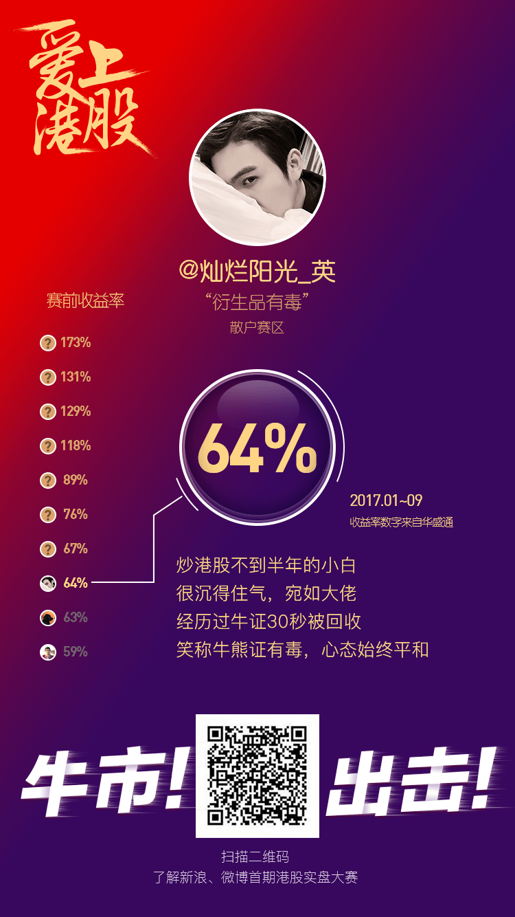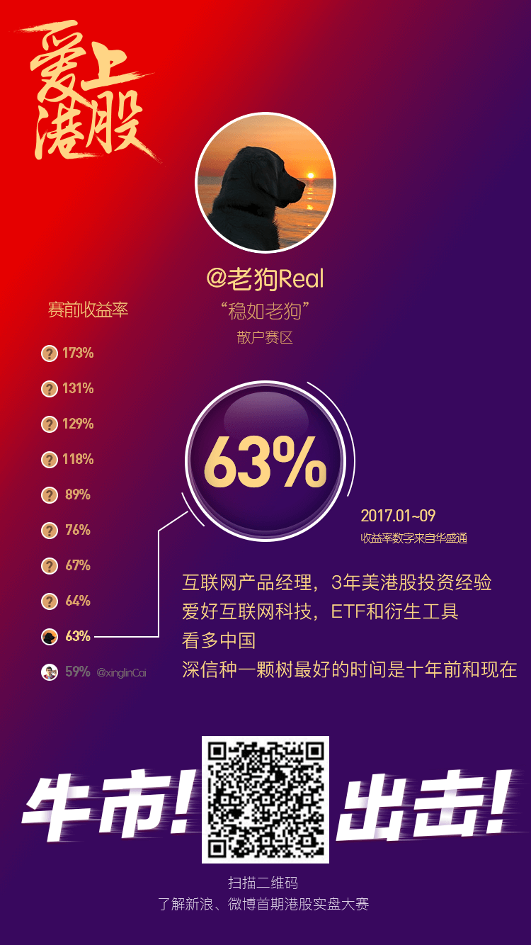 最终,我们选取了10位用户,在2017年都有着非常亮眼的投资业绩(其中有3位收益率超过100%),他们愿意和大家分享自己的港股心路。这10位用户来自各行各业,身份不同,投资时间也有长有短,但都有一个共同点,就是对港股市场具有浓厚的兴趣。让我们一起感受下,他们对港股的爱,也希望能给更多华盛用户的投资之路,带来启发。