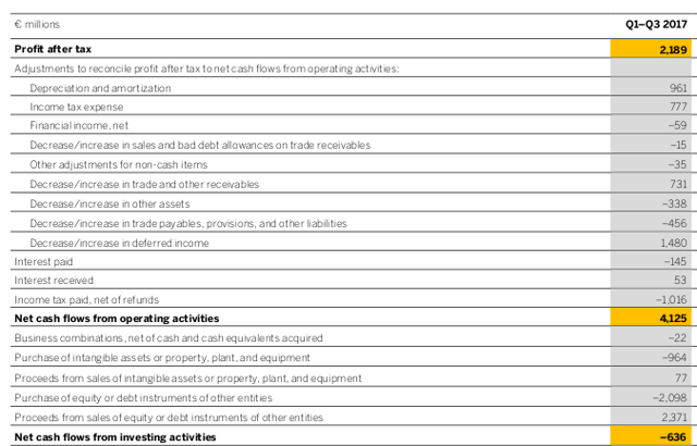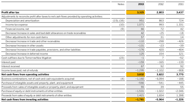 从下表可以看出,2011财年至2013财年期间,思爱普的营运现金流基本维持在38亿欧元左右的水平。资本开支在4亿欧元至5亿欧元之间。2017年,预计资本开支将增至11亿欧元,同时营运现金流将达50亿欧元。