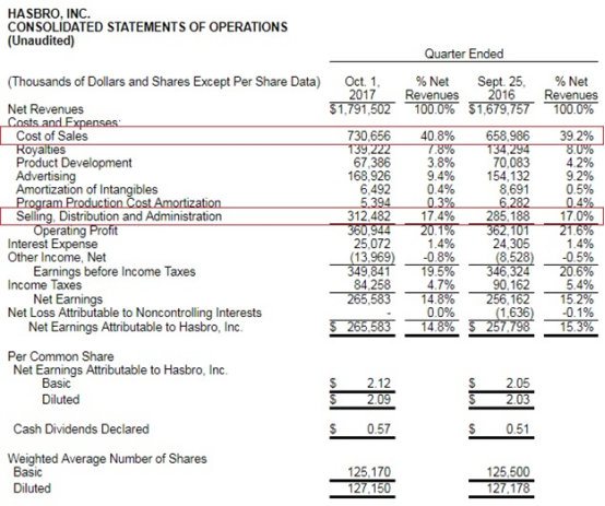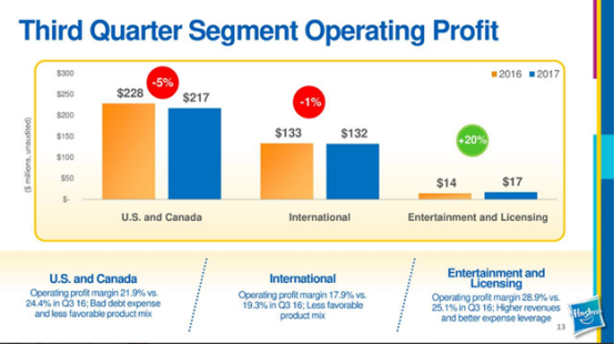 管理层解释,玩具反斗城破产造成的坏账是营业利润下降的主要原因。孩之宝运营利润基本持平,营业利润率下降至20.1%,2016年为21.6%。如果剔除坏账影响,营业利润率将会高1%。在公司报表中可以看到销售,分销和管理费用(包括坏账费用)与上一财年相比增长了0.4%,销售成本也上涨了1.6%。