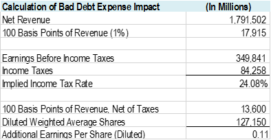 根据上表,营业利润总额增加了1%,净收入增加约1360万美元,每股收益(稀释)增加约0.11美元。除去坏账费用影响,营业利润较上年同期有所增加,营业利润率略有下降约0.5%。综上所述,我不认为经营利润是一个很大的问题。