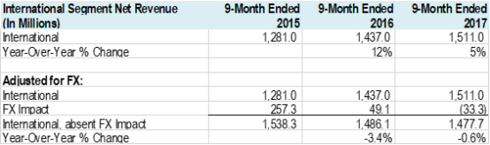 公司的国际业务增长是投资者持续关注的问题。根据上述幻灯片,2017年1-9月的国际增长率为5%,而2016年同期为12%。计算汇兑损益后的国际业务部门2015年、2016年和2017年1-9月期间的收入情况如下: