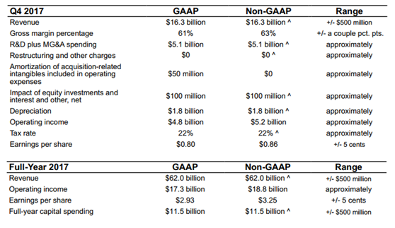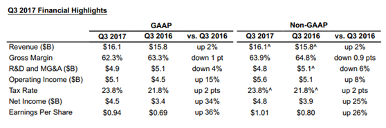 非美国通用会计准则下,公司第三季营收160亿美元,同比增长2%;不考虑McAfee是增长6%;