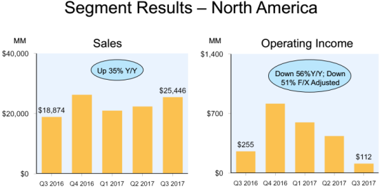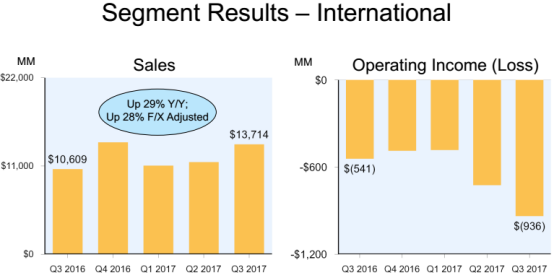 按不同地域划分,公司北美市场第三季度营收为254.5亿美元,相比去年同期的188.7亿美元同比增长35%,营业利润为1.12亿美元,相比去年同期的2.25亿美元同比下滑56%,不计入汇率变动影响则同比下滑51%。国际市场第三季度营收为137.14亿美元,相比去年同期的106.09亿美元同比增长29%,不计入汇率变动影响则同比增长28%,营业利润为负9.36亿美元,相比去年同期的负5.41亿美元亏损扩大。