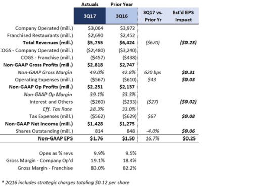 今年,运营费用下降了近28亿美元,比去年同期增长了21%。15%的支出减少源于与企业运营的餐馆相关的成本节约。通过重新特许经营,这些公司运营的店面开支减少了1.46.3亿美元,至81.9亿美元。与经营商店相比,这是一个明显的进步。经营费用的小幅下滑,帮助麦当劳将毛利润率改善,而非公认会计准则下的税率更低,提供了进一步的利润上行空间(见下面的损益表)。非公认会计准则每股收益调整为1.76美元,还不到一致预期的1.77美元。在我看来,这是由于2017年三季度的风暴袭击了得克萨斯州和佛罗里达州,美国业务受到重创造成的。