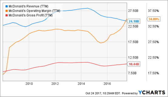 正如下图所示,在过去几个季度里,麦当劳的收入一直在下降,而且我预计在可预见的未来该趋势不会逆转。整个过程中,毛利润一直保持稳定,因为从特许经营业务中获利的利润抵消了公司运营的利润下降的影响。由于运营杠杆发挥了作用,公司的利润率有所提高,但我不认为会进一步提升。