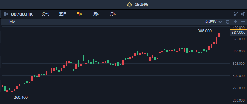 腾讯控股(00700)近期再度发挥“王者本色”,股价连续六个交易日上扬,十一月首三个交易日更加三度破顶,昨收报378.8元,上升2.93%,再创收市新高。