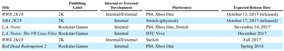 公司旗下2K工作室以策略和复合类型游戏著名,《文明》系列、《生化奇兵》系列被广大玩家所熟知,当年销量均登临各国榜首;Rockstar知名IP包括:《GTA》系列,工作室还开发《马克思佩恩》系列、《荒野大镖客》系列。