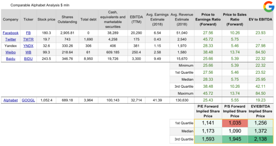 从图中可以看出,无论是企业价值倍数、市盈率还是市销率都显示谷歌目前的估值处于行业内较低水平,可见谷歌股票还有上涨空间。从企业价值倍数来看,公司目前的股价甚至低于目标股价区间的最低价格。以上只是粗略的估值分析,毕竟用于对比的各公司处于生命周期的不同阶段。