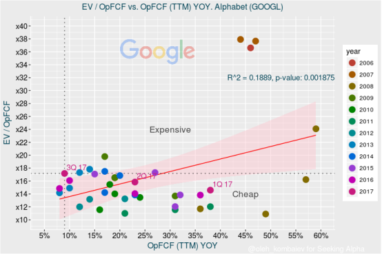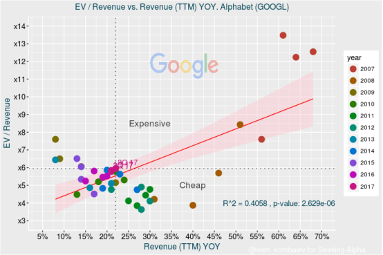 谷歌2017财年第三季度营收同比增长22.27%,为三年来最佳表现。谷歌目前的市售率相比之前两个季度的平均水平不算太高,处于反映谷歌营收增长和市售率历史关系的回归线的置信区间。从图中可见,公司的营收增长与市售率依赖性强,这表明在投资者眼中,营收增长占据重要地位。