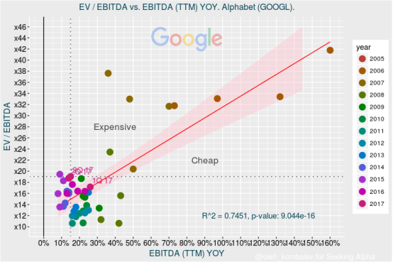 过去两个季度的EBITDA增速远超平均水平。从这点来看,谷歌目前估值略高。