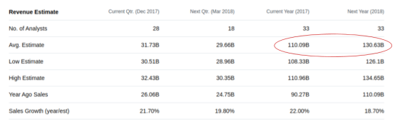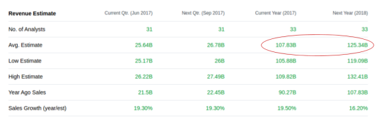 谷歌第三季度财报超出市场预期,市场看好公司的销售前景。下图是今年6月雅虎财经分析师对谷歌2017年和2018年业绩的平均预期情况。