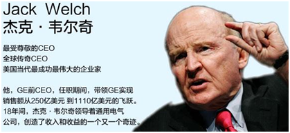 杰克韦尔奇,最受尊敬的CEO,全球第一CEO。1960年韦尔奇加盟通用电气公司,一年后,因公司官僚主义体制欲辞职另谋他就,在上司4个小时的挽留下,韦尔奇最终在1968年成为公司最年轻的总经理,1979年担任副董事长,1981年经过9年考评,韦尔奇成为通用电气历史上最年轻的董事长和CEO;