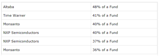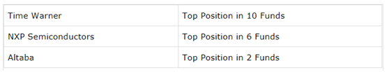 这是连续第二个季度有两只股票出现在机会每一个投机基金的资产组合里,统计的38个基金里,时代华纳和恩智浦出现了30次。最近,这两个股票也有一些重磅新闻:时代华纳被AT&T收购的事似乎要闹上法庭,因此,传言司法部将阻拦这项并购时,该公司的股价跌了差不多15个点。不仅是这30多个 基金持有时代华纳,而且有9个基金持仓超过10%。如果AT&T收购时代华纳最终泡汤了,投机盘抛压应该比大多数人预计的要大。