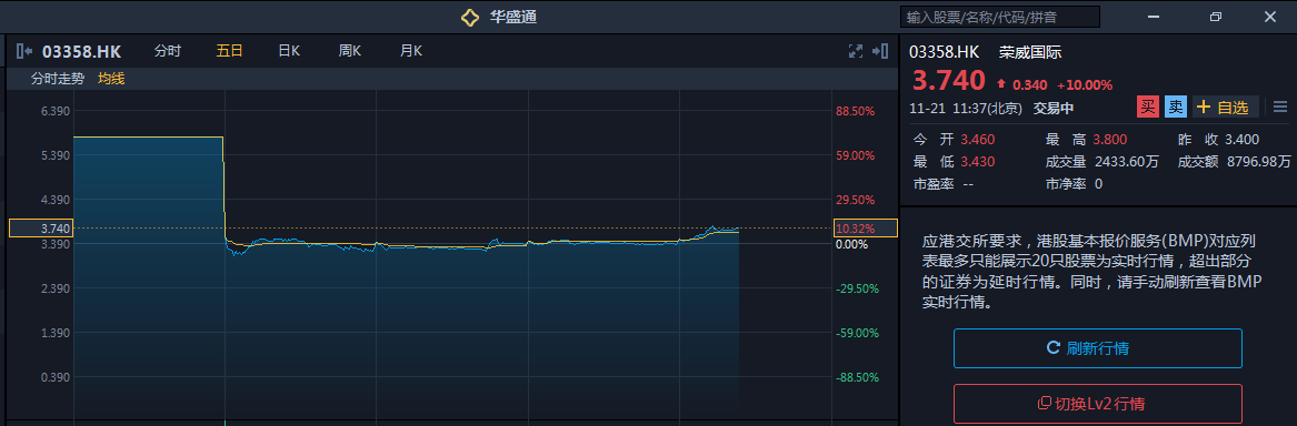 11月16日,我以均价3.29港元买进了30万股荣威国际(3358.HK,以下简称“荣威”),现价是3.7港元,处于微盈状态。
