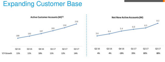 在Venmo中,移动账户占了PayPal总交易量的三分之一(比去年增长了54%),端对端的服务允许个人通过移动电话直接将钱即时转给对方,这项服务显示出了惊人的增长。在过去的12个月里,在平台上超过300亿美元的资金进行了转移,比去年同期增长了106%。此外,在最近一个季度,平台上交易的金额攀升了93%,达到90亿美元。