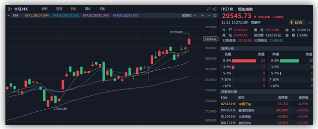今日,港股早盘在外围做多氛围下,高开过百点后持续向上。截至午盘,(700)腾讯及(2318)中国平安继续扛起冲锋大旗,前者涨至439.60HKD,后者涨至84.05 HKD,共同创出历史新高。(388)港交所涨至242元,创近两年高位。内银、保险及部分汽车股亦跟随上升。恒指冲上29635,又创近10年新高。