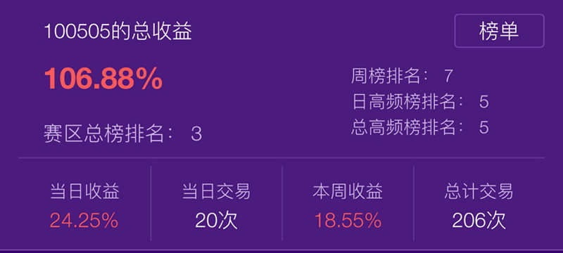 接下来让我们把目光移到一位高频操作的短炒型选手“100505”身上,目前位列主力赛区第2名,该选手开赛至今交易206次,达到平均每周交易69次,每天交易14次。