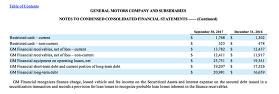 财报上说明不是很清楚,但是在最新季报,我们可以看到,公司将汽车卖给租赁商,并且保底汽车的再销售价值,这部分交易看作有息负债。截止2017年9月和去年12月底,该部分负债分别为15.7亿美元和11.8亿美元,保底3.4亿美元和2.89亿美元,记录在延递营收负债中。