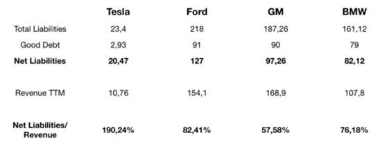 对于传统汽车公司来说,负债的一大部分都跟汽车销售和租赁有关,这一部分债务是有汽车资产支持的,因此,负债表上的负债并不是都用于公司一般业务的。